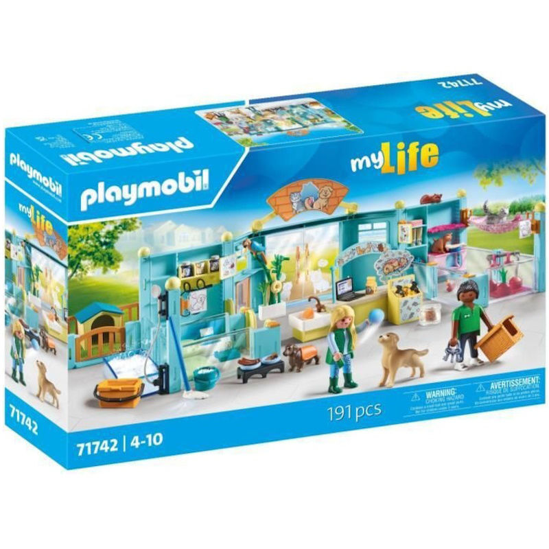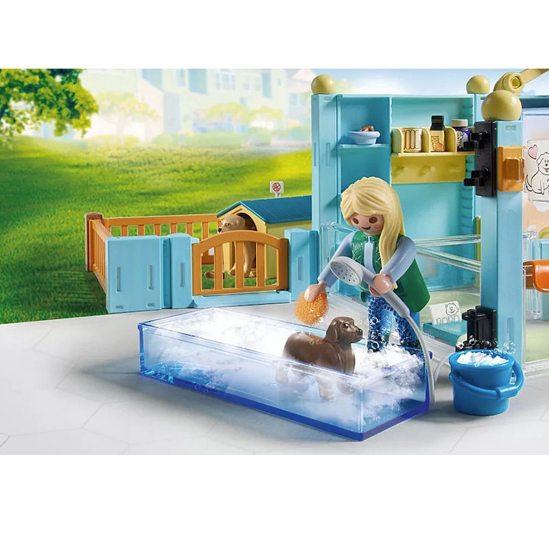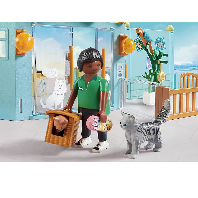 Στο PLAYMOBIL Ξενοδοχείο μικρών ζώων, κάθε φιλόζωος και φτερωτός επισκέπτης απολαμβάνει φροντίδα πέντε αστέρων! Με ξεχωριστούς χώρους για σκύλους, γάτες, ακόμα και έναν παιχνιδιάρη παπαγάλο, υπάρχει χώρος για όλους να νιώσουν σαν στο σπίτι τους. Οι σκύλοι απολαμβάνουν άνετα κλουβιά και έναν σταθμό πλυσίματος με λειτουργικό ντους χειρός, ενώ οι γάτες χαλαρώνουν σε αιώρες ή κυνηγούν παιχνίδια. Προσαρμόστε τις ταΐστρες με τα ονόματα που περιλαμβάνονται και διακοσμήστε το ξενοδοχείο όπως σας αρέσει!