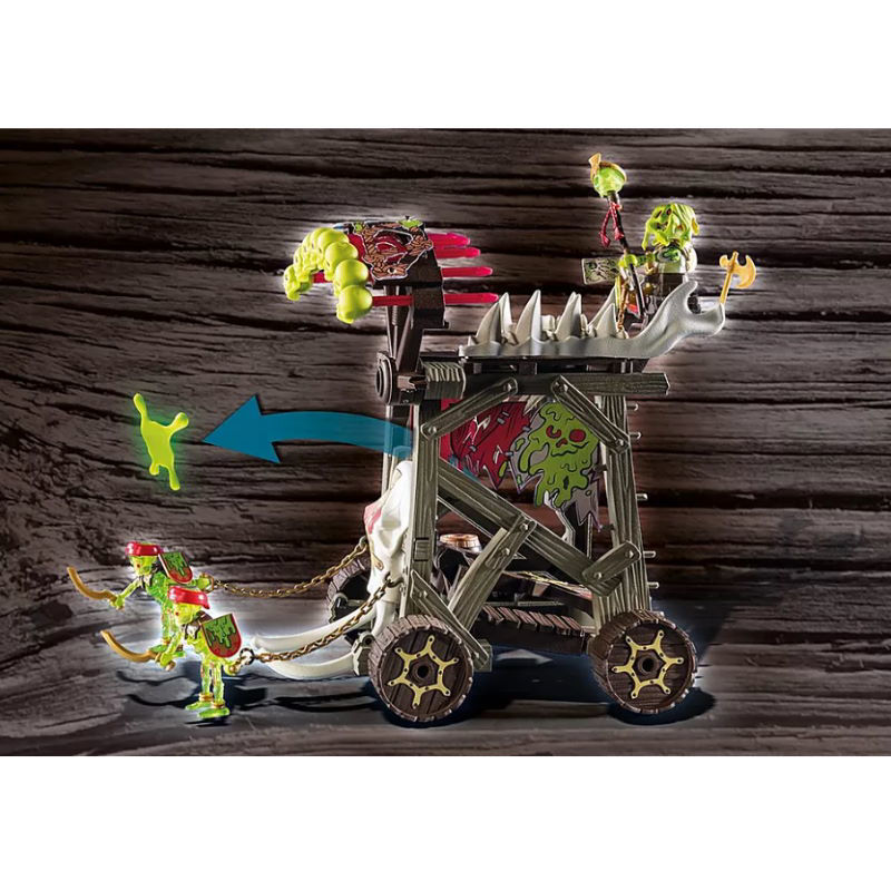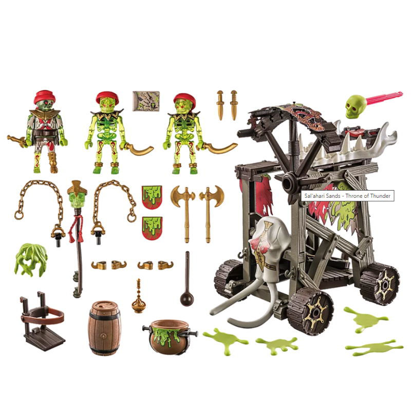 Στον πύργο επίθεσης τους, ο στρατός των σκελετών επεξεργάζεται μια ουσία που μοιάζει με λάσπη σε επικίνδυνα βλήματα και λίμνες λάσπης. Επιπλέον, το Thunder Throne προστατεύεται από μια επικίνδυνη μπαταρία κρανίου που μπορεί να εκτοξεύσει πυραύλους κρανίου εναντίον εχθρών με αστραπιαία ταχύτητα. Ο πύργος με ρόδες τραβιέται από δύο ανατριχιαστικούς σκελετούς. Ένα συναρπαστικό σετ παιχνιδιού PLAYMOBIL με πολλές λειτουργίες για συναρπαστικές περιπέτειες παιχνιδιού. Για ακόμα περισσότερη διασκέδαση, ο πύργος επίθεσης μπορεί να συνδυαστεί με το σετ 71027 Sal'ahari Sands - Mammoth Attack.