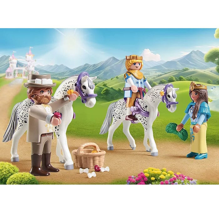 Το άλογο είναι καλαίσθητα διακοσμημένο και έτοιμο για μια βόλτα μέσα στη μαγική χώρα των πριγκιπισσών, ενώ η φιγούρα της πριγκίπισσας συμπληρώνει την εικόνα και προσφέρει αμέτρητες δυνατότητες παιχνιδιού ρόλων.