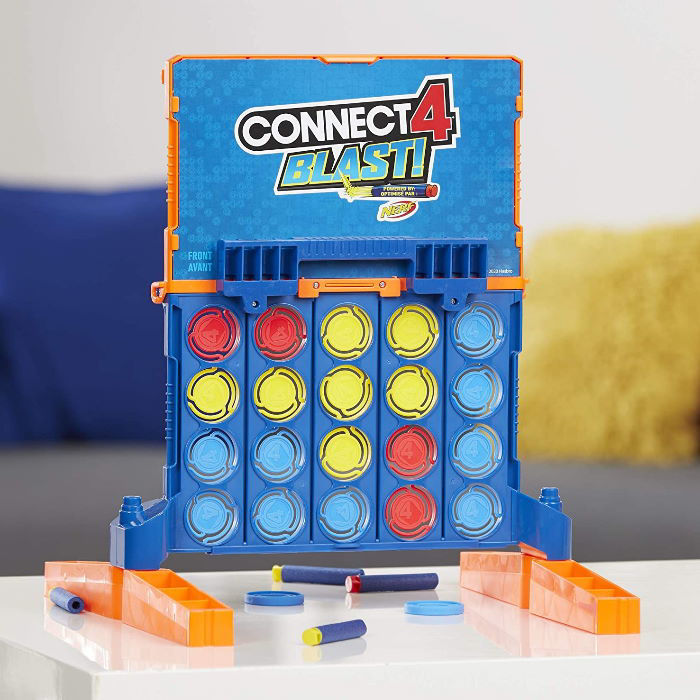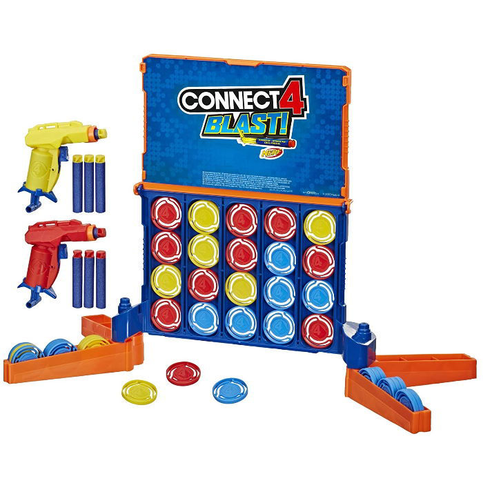 Το παιχνίδι Connect 4 συναντά το Nerf dart blasting! Το Connect 4 Blast είναι ένα συναρπαστικό και ενεργό παιχνίδι, στο οποίο οι παίκτες πυροβολούν στρατηγικά τους χρωματιστούς δίσκους χρησιμοποιώντας τα βελάκια Nerf, που περιλαμβάνονται και τα βελάκια αφρού Nerf. Οι παίκτες το αντιμετωπίζουν ταυτόχρονα προσπαθώντας να είναι ο πρώτος παίκτης που θα πάρει 4 δίσκους στη σειρά του χρώματος. Δείξτε τις ικανότητές σας στοχοθέτησης πυροβολώντας τους Nerf blasters στους δίσκους. Τοποθετήστε τους δίσκους που έχουν εκραγεί στο δίσκο φόρτωσης στο πάνω μέρος του πλέγματος και συνεχίστε να παίζετε καθώς πέφτουν αυτοί οι δίσκοι. Το παιχνίδι προορίζεται για 2 παίκτες και περιλαμβάνει μέρη για να δημιουργήσετε το πλέγμα Connect 4, καθώς και μπλε, κόκκινο και κίτρινο δίσκο, 2 χρωματικούς κωδικούς Nerf blaster και 8 χρωματιστά βελάκια αφρού Nerf.
