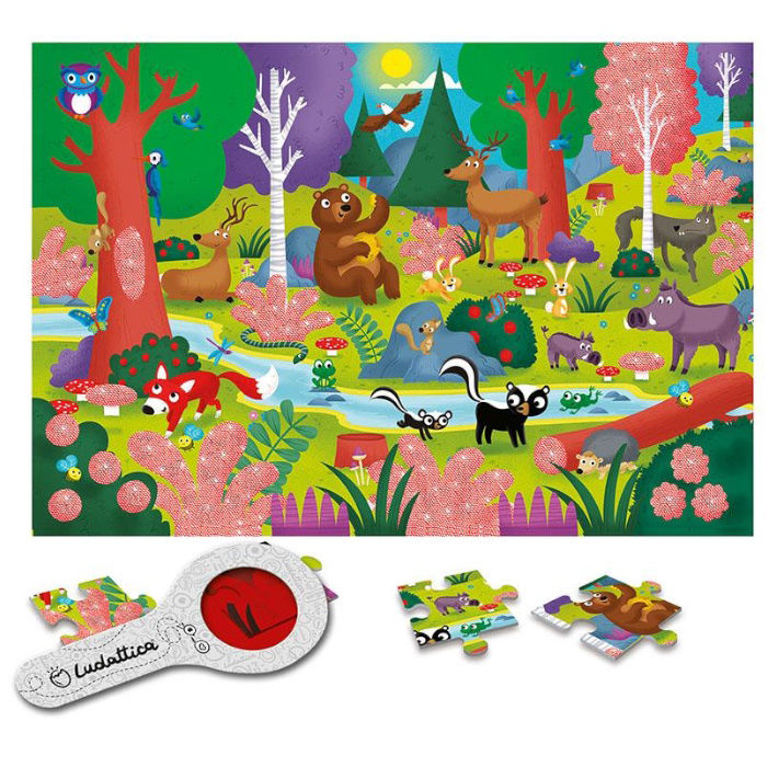 Το παιχνίδι αυτό περιλαμβάνει ένα παζλ 24 κομματιών με θέμα το "Δάσος" κι ένα πρωτότυπο ζευγάρι κιάλια για έξτρα διασκέδαση! Το παιδί συνθέτει το παζλ και στη συνέχεια με τα κιάλια ανακαλύπτει διάφορες μικρολεπτομέρειες που κρύβονται, μέσα στην εικόνα, στα κομμάτια με την αχνή εικονογράφηση! Ένα διασκεδαστικό παιχνίδι που ενδυναμώνει τις λεπτές κινητικές δεξιότητες, τονώνει την περιέργεια και την παρατηρητικότητα και παράλληλα αυξάνει τη συγκέντρωση του παιδιού.