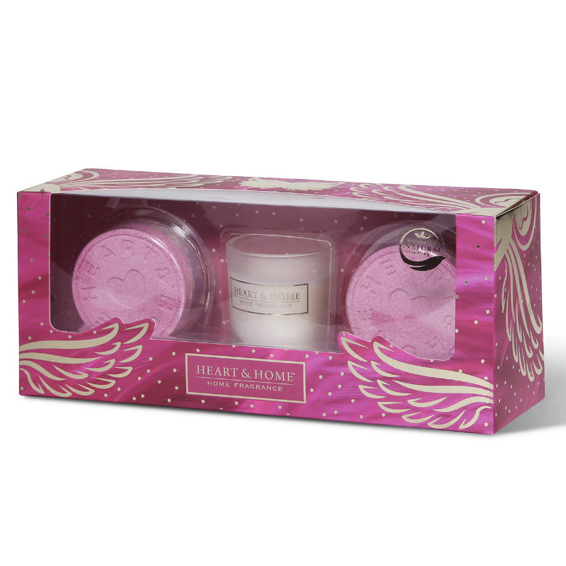 Σετ δώρου με μίνι κερί και δύο bath bombs άλατα μπάνιου, η απόλυτη τελειότητα της περιποίησης. Το μίνι κερί σόγιας έχει πλούσιο γλυκό άρωμα Guardian Angel, ενώ τα άλατα μπάνιου περιέχουν φυσικά αιθέρια έλαια, λάδι καρύδας και βούτυρο καριτέ για μέγιστη ενυδάτωση.