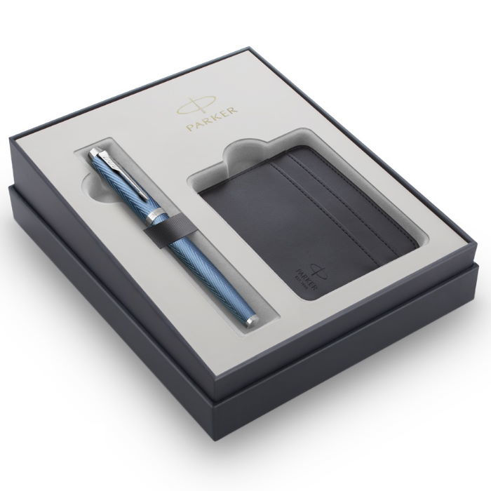 Το Parker IM Premium Blue / Grey Chrome Trim είναι όμορφα σχεδιασμένο με μια αναζωογονητική μπλε-γκρι επιφάνεια λάκας διακοσμημένη με το μοντέρνο και αποκλειστικό μοτίβο Parker Chevron. Επιπλέον, συμπληρώνεται με όμορφες λεπτομέρειες σε χρώμιο. Η μύτη του στυλό είναι κατασκευασμένη από ανοξείδωτο χάλυβα.