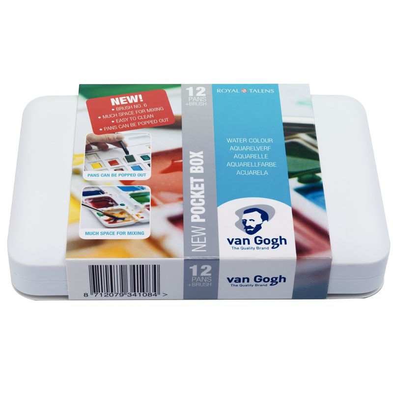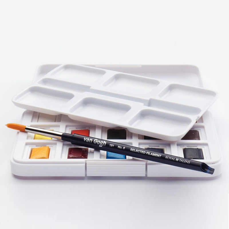 Αυτό το σετ υδατοχρωμάτων 12 τεμαχίων είναι συσκευασμένο σε πλαστικό κουτί τσέπης και περιλαμβάνει επίσης μια στρογγυλή βούρτσα συνθετικών μαλλιών (μέγεθος 6) και ένα δίσκο ανάμειξης.