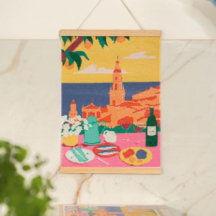 Στον καμβά της Hoglet & Co, το Menton εμφανίζεται κομμάτι κομμάτι. Χιλιάδες μικρές ψηφίδες λάμψης σμίγουν για να σχηματίσουν μια εικόνα γεμάτη καλοκαιρινό φως και γαλάζιο. Δεν είναι μια απλή χειροτεχνία, αλλά μια αργή, σχεδόν διαλογιστική διαδικασία. Η κίνηση του χεριού, ο ήχος των μικρών διαμαντιών, η σταδιακή αποκάλυψη του σχεδίου , όλα θυμίζουν ρυθμό αναπνοής.
