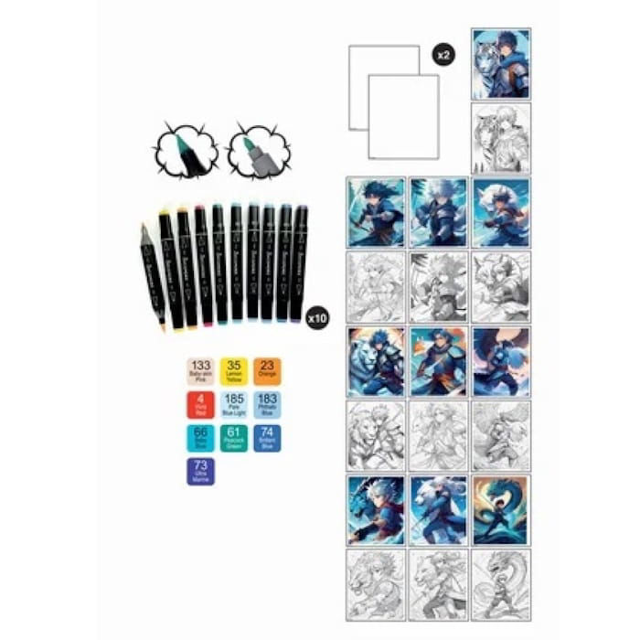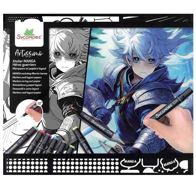 Η απόδειξη της ποιότητας αυτού του πακέτου βρίσκεται στους 10 μαρκαδόρους οινοπνεύματος διπλής μύτης (Brush & Fine), οι οποίοι επιτρέπουν στον καλλιτέχνη να δημιουργεί εντυπωσιακές φωτοσκιάσεις και λεπτομερή περιγράμματα στις στολές και τα χαρακτηριστικά των ηρώων. Το σετ περιλαμβάνει 10 προτυπωμένα φύλλα με δυναμικές πόζες Warrior Heroes, 10 ειδικά φύλλα layout Α4 που εμποδίζουν το μελάνι να διαπεράσει το χαρτί, καθώς και έναν αναλυτικό οδηγό εκμάθησης που καθοδηγεί τον χρήστη στα μυστικά του επαγγελματικού Manga style.
