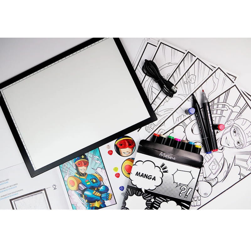 Η απόδειξη της ποιότητας αυτού του σετ είναι το εξαιρετικά λεπτό και φωτεινό Led Light Pad (φωτεινό τραπέζι), το οποίο επιτρέπει την εύκολη αντιγραφή περιγραμμάτων ακόμα και σε παχύ χαρτί. Το πακέτο περιλαμβάνει 10 μαρκαδόρους οινοπνεύματος διπλής μύτης (Brush & Fine) για επαγγελματικές διαβαθμίσεις, 10 προτυπωμένα φύλλα με χαρακτήρες Manga, 10 φύλλα layout Α4 που δεν ποτίζουν, έναν μαύρο μαρκαδόρο λεπτής γραφής για περιγράμματα, καθώς και έναν αναλυτικό οδηγό εκμάθησης βήμα προς βήμα.