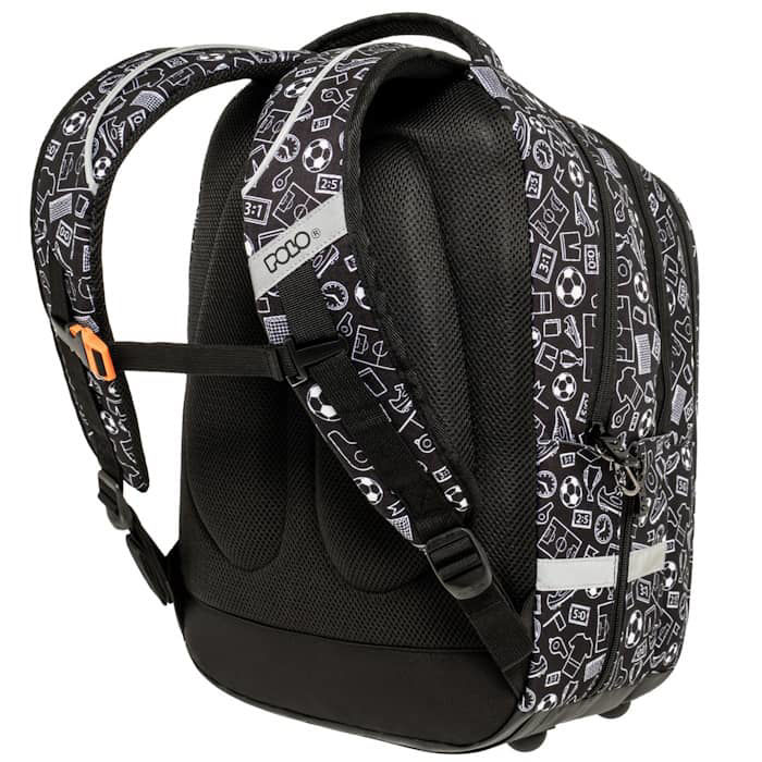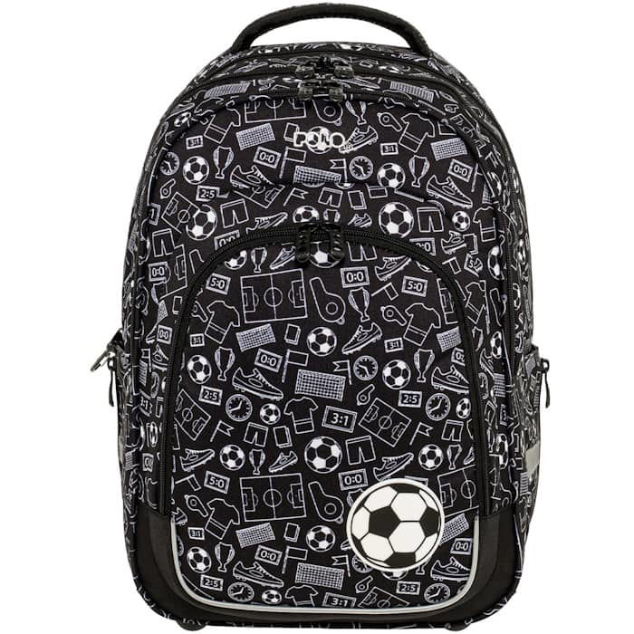 Η τσάντα πλάτης Polo Fusion Football μαύρη είναι σακίδιο 25lt, κατάλληλο για μαθητές δημοτικού. Διαθέτει 3 κεντρικές θήκες, εκ των οποίων η μία είναι επεκτεινόμενη, 1 μπροστινή τσέπη και 2 πλαϊνές θήκες με φερμουάρ.Η εσωτερική ενισχυμένη θήκη φιλοξενεί laptop έως 15,6". Στη βάση του σακιδίου βρίσκεται αδιάβροχο κάλυμμα σε κρυφή τσέπη. Η πλάτη είναι εξοπλισμένη με ανατομικούς, αεριζόμενους ιμάντες, ενώ υπάρχουν και ιμάντας στήθους με σφυρίχτρα και ιμάντας μέσης. Ανακλαστικές λεπτομέρειες και αντικλεπτικό σύστημα στην πίσω θήκη συμπληρώνουν τα χαρακτηριστικά.