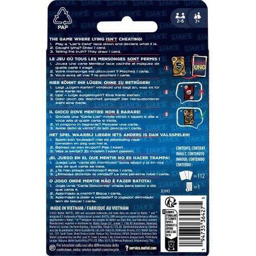Οι φίλοι του UNO θα λατρέψουν το UNO Liar’s Edition, μια διασκεδαστική παραλλαγή του κλασικού παιχνιδιού καρτών όπου το μπλόφαρισμα είναι μέρος του παιχνιδιού! Οι παίκτες μπορούν να παίξουν κάρτες κρυφά και να ισχυριστούν τι κάρτα έβαλαν, αλλά οι αντίπαλοι πρέπει να αποφασίσουν αν λένε την αλήθεια ή αν μπλοφάρουν.