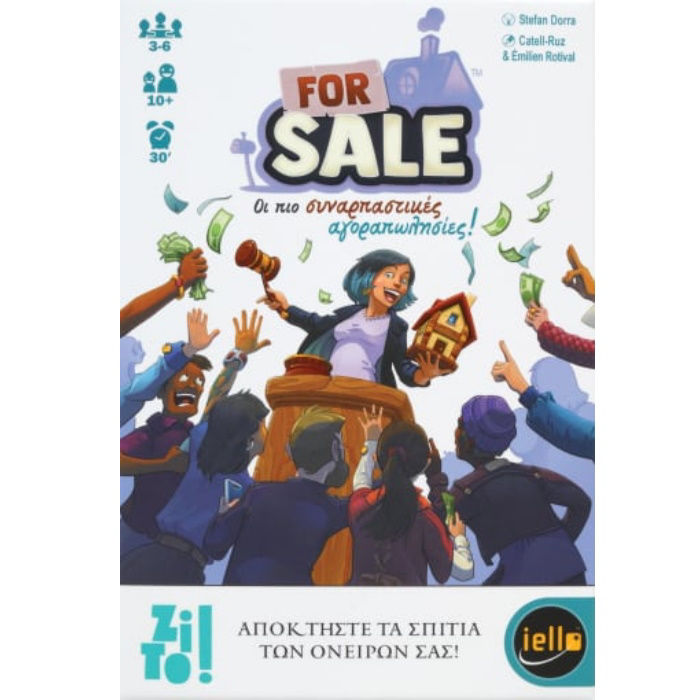 Πιστεύετε πως οι κτηματομεσίτες είναι αδίστακτοι; Αποδείξτε πως εσείς είστε οι καλύτεροι! Το For Sale είναι ένα εύκολο και έξυπνο παιχνίδι πλειοδοσίας! Αγοράστε σπίτια στη χαμηλότερη δυνατή τιμή.. και μετά πουλήστε τα με το μεγαλύτερο δυνατό κέρδος! Θα εκτιμήσετε με ακρίβεια την αξία των καλύτερων ακινήτων για να αποκτήσετε τις μεγαλύτερες επιταγές; Γίνε εσύ ο καλύτερος μεσίτης! Το For Sale συνδυάζει καθαρό σχεδιασμό και πρωτότυπο μηχανισμό! Απλό, έξυπνο και πολύ διασκεδαστικό!